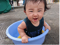 いつもと違う環境の中、水に入ることに抵抗があるかと思いきや、少し足に水がつくとすぐにぱちゃぱちゃと足を動かして感触を楽しみ始めてあそびだしました。タライに座っても手足をつかって水を堪能したきなりくん。時にはタライの淵をつかんで体をあげようとしたり、タライの外に出来た水たまり目がけて手を伸ばそうとしたりと周りのものにも興味津々のようでした。