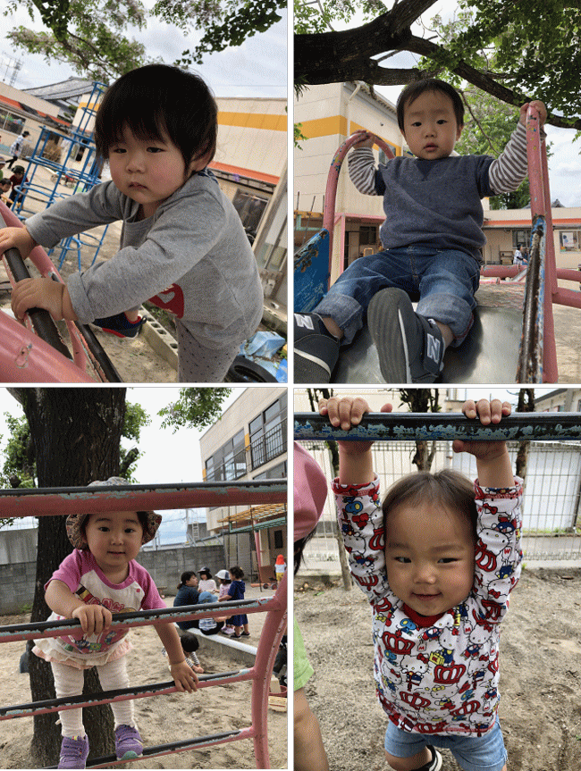 しかし、支えられながらも自分で一番上まで登りきることができるようになったすずちゃん、えみかちゃん、あかりちゃん。さきちゃん、なのはちゃん、めいちゃんもほぼ上の方まで登れるようになり、少しの手伝いで一番上までいけるようになりました。こうきくんは、滑り台の逆のぼりが大得意でとても上手にすいすい登り、上に座って景色を楽しむのが大好きです。みさきちゃん、たいちくん、あきなちゃんも「登ってみようかな・・・」と手を伸ばすことも増え、興味を示してきています。