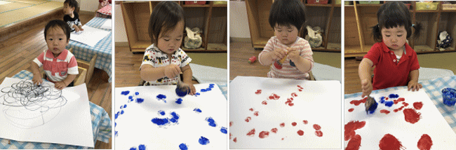 画用紙いっぱいに大きく腕を回して描く子、「トントントン???」と言いながらトントンと打ち付ける感触を楽しむ子、力強く打ちつけて絵の具が弾ける感触を味わう子、同じ《描く》ということでもそれぞれの《描き方》があります。描くことで自分が動いたりイメージしたものが実際の形として表れるという体験を通して描く楽しさを感じていけたらと思います。これからも発達に合わせていろいろな体験を増やしていけたらと思います。