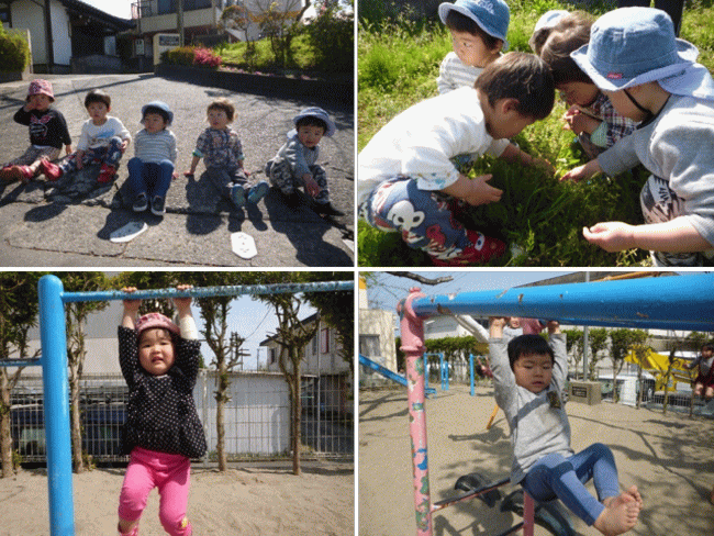その姿がとてももかわいらしく、春を感じているんだなと実感させられました。2歳児さんと散歩する中で最近はいろんな言葉がたくさん聞かれるようになりました。自然と「みてみて、きれいだね、きてきて」と友だちとの関わりもみられるようになりました。