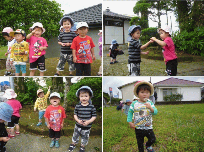 先週の雨あがりの散歩の出来事です。ひまりちゃんが「何かがあるよ」とお友だちに問いかけました。子どもたちが不思議そうな表情をしていたので私が「うめだよ」と教えるとえいじくんが「からいのと言いました。私が「すっぱいよ」とえいじくんに教えると、えいじくんはお友だちに「すっぱいよ」と顔の表情まで溢れて教えていました。雨あがりのためうめにも雫があり、草はらにも雫がある光景を一緒に共感することができました。