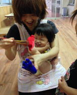 あしの裏に絵の具を塗るのをくすぐったいような気持ちいいような表情で見つめるかほちゃんは、足の裏に絵の具を塗る度に「キャッキャ!」と笑い声を上げ、楽しんでました。また、パンツ一丁になってボディペインティングもしましたよ。先月16日に入園したばかりの徳留ゆうき君は、誰よりも楽しんでやっていましたよ!絵の具に足や手を自分でつけて紙いっぱいにペタペタとスタンプしていました。入園してからの一番の笑顔を見れた瞬間だったと思います。これからも子ども達のかわいい笑顔がたくさん見たいので笑顔になれる活動をしていきたいです。