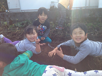寝転がって遊ぶさらちゃんやりきとくん、たかひろくんなど「見て!イエーイ!」とピースサインをして嬉しさを表現しており、土の気持ちよさを感じていましたよ。また、そなちゃんやりゅうしんくんをはじめ、多くの子が泥だんごを作っては、土の上に落として「壊れないよ」「固くした!!」と自慢の泥だんごの硬さを競ったり、披露して遊んでいました。かぴら・べなれすには泥だんご名人がたくさんいるので、カッチカチの固い泥だんごがたくさん出来上がりましたよ!夢中になるほど時間が過ぎるのが早く、帰りは自慢のだんごを大切に持って帰りました。心を開放して自然を体で感じる楽しさを満喫できることは子ども時代の特権ですよね!