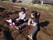 芋ほりに行った日、「もっと畑で遊びたかった」という子ども達の声が多かった為、後日思いっきり畑で遊べる時間をつくるという約束でした。こんな寒い中で大丈夫かな?と心配するところもありましたが、陽射しと防寒のおかげで、予定通り遊ぶことができました。畑を思いっきり駆け回ったり、ぺたんとお尻をつけて泥だんごづくりを始めたりと自由に遊びを楽しみます。