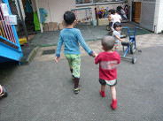 12日の朝のグループ活動の様子をお伝えしたいと思います。この日はお泊りに行っている為、朝から5歳児さんやリーダーがいませんでした。早番の保育者が係り活動に気づけるように声を掛けたり、3・4歳児さんで頑張っていけるようにと言葉を掛けると、子ども達の意欲も高まり、集まって自分の仕事に取り組んでいました。4歳児さんがリーダーの代わりになり、係り活動に気づいていない3歳児さんを誘い、活動を促します。その中で、てんせい君は自分のグループの仲間がみんな来ておらず、一人で庭掃除をしないといけない状況になりました。他のグループの友達もてんせい君に気づき、一人では大変だと感じたようで「後から手伝うからね」と声を掛けて、自分の係り活動を始めようとしていました。すると、エサ切り当番のグループだった大翔くんが、「いいこと考えた。てんちゃんも一緒にエサ切りして、終わってからみんなでほうきしよう!」と提案したのです。