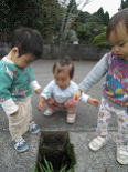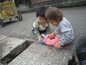 落とす楽しさはあらゆるところで最盛期を迎えており、散歩先でも一番の遊びとなっているのが感じられます。クラスだより上部の写真はらくくんがフェンスの穴から石ころを落とす姿です。下の写真ではらくくんと、りなちゃん、ゆうひちゃんが3人揃って側溝に石ころや木の実などを落として楽しんでいます。同じくりきやくん、ゆうとくんも入れて遊ぶ姿が見られました。