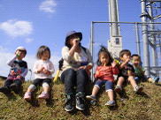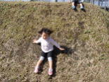 友だちとの関わりが出てくると真似っこからやり取りが出てきます。共感しあうと笑いも起こり「一緒にしよう」と誘い合って遊んでいます。しばらく遊んでいる様子を見守りつつ「土手滑りしてみない?」と誘うと「どこで?」と返ってきました。「ここから滑るのよ」と言うと“えー”と面白いくらいの表情で返ってきました。「えー、出来ないの?」と少し試すように言うと「出来るし」と返ってきました。