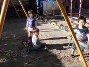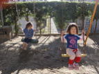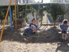 朝の会で、「今日は、ブランコで遊ぼうか?」と話をすると「するする!」と乗り気な子どもたちでした。しかし、園庭のブランコは安全上の問題もあり昼間に取りつけまた外すので朝のうちはついていません。
