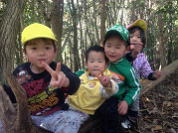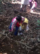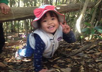 この日は2歳児さんも一緒に行くため、以上児の子ども達はすぐに2歳児さんと二人組になったり、「一緒に行こうね」と近くに寄り添ったりし、山道へ進もうとします。“2歳児さんを自分たちが守ってあげなきゃ!”という以上児さんの優しさとそれを頼りにしている2歳児さんのまなざしが、なんとも微笑まし光景でした。山道では竹が倒れており、そこを潜り抜けたり、大きな木をまたいで乗り越えたりと子ども達にとっては大冒険のようです!