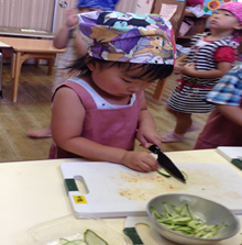 4歳児さんはきゅうりの細切りに挑戦しました。縦に細く切ることを、見本を見せながら伝えると、みんな細く切ることを意識して丁寧に細く切っていましたよ。縦・横の言葉でも意味を理解し、その通りに切ることができており、包丁の使い方も安心して任せられるようになってきました。