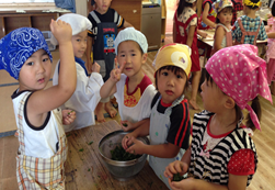 先週の土曜日にクッキングがあり、中華風ソーメンを作りました。5歳児さんが錦糸卵づくりをし、4歳児さんがきゅうり・プチトマトを切り、3歳児さんは、畑から大葉を取ってきて、小さくちぎる作業をしてくれました。先月のクッキングでも大葉をちぎる作業があり、慣れた手つきで、“任せなさい”と言わんばかりの様子で上手にちぎってくれました。