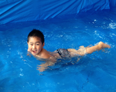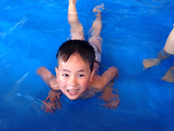 4・5歳児さんは、とても水と親しんでおり、もぐったり泳いだりとそれぞれ自由に楽しんでいるところです。バタ足で前に進む楽しさを味わい、「こんだけ泳げる」「見ててね!」と成果を周りに見てもらうことで、もっと進めるようにと目標を持って泳いでいますよ。