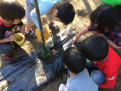 さっと活動を終え、いざ芋畑へ。畑につくなりすでに植えてある芋の苗や普段あまり触らない畑の土に触れ大喜びの子どもたちでした。苗植えは、苗挿し棒を使い子どもたちでも簡単に苗植えができました。1つできれば自信が持て「ここにしていいですか」とどんどん苗をさして夢中で楽しむ子どもたちでした。