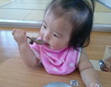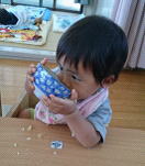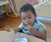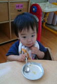 初めは食べさせてもらっていた子どもたちも今ではみんな野菜煮を手づかみで食べることができます。手を添えて飲んでいたお汁も、時には自分で両手で上手に持ち、こぼしながらもごくごくと飲み、飲み終わると「あー!!」と満面の笑顔を見せてくれます。そして、始めはただ持っているだけのスプーンでしたが、手を添えながら食べるうちに、自分ですくって入れようとしたり、手で一旦持ってからスプーンに入れたり、スプーンの上に入っている野菜煮を口に運んだりと一生懸命です。時にはできずに「ん〜!!」とはがゆさを感じながら私たちに「やって〜」という風に差し出すこともあります。