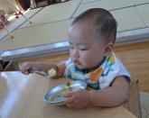 さて、秋といえば食欲の秋!秋に限らずですが0歳児の子どもたちは動きが活発になってきた分、給食の時間が待ち遠しくて仕方ありません。ご飯の準備をしようと机を出すと自分の場所に行ったり手を洗いに行こうとするなど、自分から動き出すことも多々あります。給食を運んでくると早く食べたくて机をバン!バン!!とたたいてみたり、取り皿をかちゃかちゃとならしてみたりと、それはそれはにぎやかな給食の始まりです。