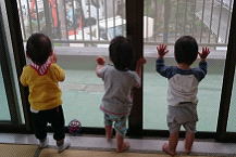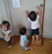 しかし日常ではそれはそれは動きが活発になった子どもたち。保育室・園庭・散歩先でも気になった場所に一直線!トコトコと歩き出すことも増え、段差を登ることも多くなってきたので、テーブルの上の物に手を伸ばしたり押入れに入っておもちゃを取り出してみたりといろいろ探索を楽しんでいる毎日です。そんなある日、保育室のドアを閉めているとそこに集まる子どもたち。