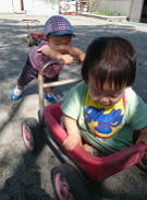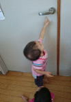 いつもドアをバンバンとたたくことはよくあるのですが、子どもたちは本当によく見ています。ノブを下げれば開くことを知っているのでしょう。ノブに手を伸ばします。しかし背伸びをしても届きません。すると積木の箱をズズズ…と押して持ってくるげんきくん。何をするかと思いきや…そこにのり、ノブをがちゃ!押して開くことまではできませんでしたが、「てつだうよ!!」というかのようにバンバン!とたたくともきくん。まさに共同作業でした!その後もチャレンジャーは続々とあらわれ、子どもたちの試行錯誤の繰り返しに驚きと感心するばかりでした。