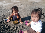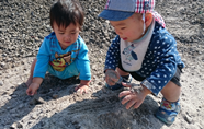 少し時間があったので、その場にみんなおりるとまたよじよじと石の山を登ってみたり、近くのさらさらの砂を触って喜んだり、石を打ち合わせてみたり…とあそび方は子どもたちそれぞれ。しかし、誰かが石を持つと「ちょーだい」という