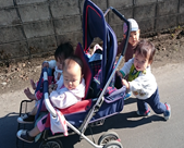 今までベビーカーからでは体験できなかった自分の興味のあるものに一直線出来る探索活動をたっぷりとし、Uターンする姿もしばしば。少しお兄ちゃん・お姉ちゃん気分になるのか、ベビーカーに乗っている他の子どもたちにひろった落ち葉をもってきてくれたり、自分たちで押してくれたりと関わり方も様々で微笑ましい姿をたくさん見せてくれます。