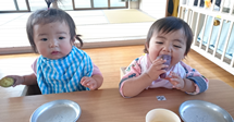 、とれると嬉しそうに見せてくれたり次に手を伸ばしたりしていました。この日のおやつにお芋が登場し、子どもたちは嬉しそうにかぶりついていました。まだまだしっかりと理解はしていなくても、こういった自然体験が少しずつ自分の知識へとつながりお芋が畑にあること、秋に収穫できることなどが身をもって理解していくんだろうなと思います。