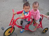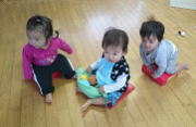 これまた器用に、お尻でつん!と押し、りあちゃんをどけて座ったげんきくん。嬉しそうな表情を横目に、ショックで泣き出すりあちゃん。もう一つ同じ缶があったのでそれを出すと、また座って納得し、2人でにこにこ。ホッとしたところへ今度はともきくんがちょうだいと言わんばかりに「あー」とげんきくんに近寄っていきました。そしてそれを見ていたけいごくんも、近くにいき指を指して「ん〜…」とやりたいアピールをしていました。