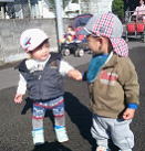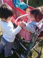 声をかけてくれたり笑わせようとしてくれたりする姿をみるととても微笑ましいです。先日は「手をつなごうか〜」というと「おてて〜」と手をつなぐけいごくん。一緒に歩いていたともきくんとも手をつなごうとそばに行き、同じように「おてて」と手を出していました。少し抵抗はあったものの初めて手をつないで歩くことにとてもうれしそうなけいごくん。好きな方に行きたくなり、ふりはらうともきくんの行動でさえも喜び、また「おてて〜」と手を差し出します。