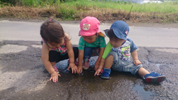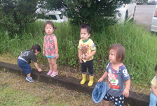 炎天下の中を歩くのは大人も大変です。ですので,木陰を楽しんだり時間や距離を考えて散歩も出掛けます。「♪どんどんばしわたれ、さあわたれ♪」とブロック塀の段差を歩いていく子ども達。その後は保育士の「♪なこかいとぼかい♪」の掛け声に勢いをつけて跳んでいます。4月5月は跳ぶのもたどたどしかったのですが足腰が大分丈夫になってきました。