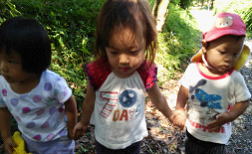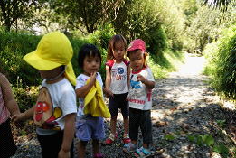 ゆうと君、かんなちゃんは触りたいけど触れない感じでした。せな君、ゆうひちゃん、ことねちゃんは3人で手を繋いで栗の話でもしていたのでしょうか?きゃっきゃっ言いながら楽しそうに,神社までのコースを仲良く歩いていました。神社で「1歳児さんが元気で毎日を過ごせますように。」とお参りをして帰りました。栗、あけび、柿等、秋の風物詩が満載です。子ども達と一緒に実り多き秋を感じていきたいと思います。