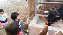 飼料もお皿に入れて牛のえさ入れに入れてあげました。牛舎の方の好意で貴重な体験をさせて頂きました。帰り道はブロック塀に引っ付いてかに歩きをしながら帰りました。これからも五感をフルに使っていろいろな体験を子ども達としていきたいです。