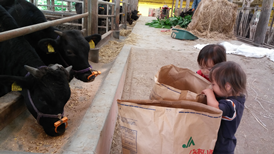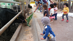子牛を見つけるとことねちゃんが「赤ちゃんがいる。」と嬉しそうに教えました。牛舎の方が丁度、牛にえさをあげていました。子ども達がじーっと牛がえさを食べているところを見ていると牛舎の方が「えさをあげてもいいよ」と言われましたのでお言葉に甘えて、えさやりに挑戦しました。フォークで草を寄せて下さり、私が最初に一掴みあげてみると、りきや君、ゆうひちゃんがすぐに真似をしてあげました。「もうさん、食べてね」「おいしいよ」と声を掛けながら牛に食べさせています。ゆうと君も近付き、牛が食べるのをじっと観察していました。