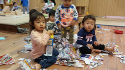 せっかくのお弁当の日でしたので、「お部屋の探検に行こうか!」と声掛けすると子ども達はとっても張り切って広告紙の片付けを頑張ってくれました。散らばっている広告紙を拾う子ども、ごみ箱を持ってきてくれる子どもと子ども達同士で自然と片づけ方も身についてきている事にとても嬉しく思いました。