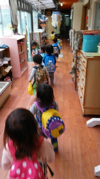 片付け終わるととっても嬉しそうに自分のリュックを背負って保育園の探検に出発しました。事務所までみんなで探検している途中らいのすけくんとこはくくんは玄関で立ち止り、いつものように靴を持ってきて履き始めました。2人は外へ散歩に行く気満々!なのですが、外はジャンジャン雨が降っています…。「なんで外へ行けないの?」と残念そうでしたが、最後は仕方ないな…とばかりに靴を持ったまま室内探検を楽しんでいたりと可愛い場面もありましたよ。