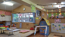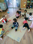 作品の中の一つに大きな家を作りました。家の壁はみんなでお絵かきしたり、屋根はシール貼りや手のひらを使って色紙を丸めて飾りつけをしました。当日は展示だけでしたが翌日はさっそく家の中に入って窓から「ばぁー」と顔を出したり家に中にお友達同士入りワイワイキャーキャーと朝からにぎやかなこえが響き渡っていました。