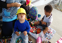 途中、場所を決めて合流してみんなでお弁当を食べる計画を立てました。二手に分かれて、いざ出発。1歳児が歩くのがゆっくりだと歩幅を合わせてくれる2歳児さん。カッコいい2歳児さんの姿を頼もしく感じながら散歩を楽しみました。かくれんぼしたり、落ち葉でお化けを作ったりしながら、合流の場所を目指しました。榎並組のはると君は、田代組の1歳児さんと早く会いたくて「先生、早くお迎えに行こうよ。」と言っていました。