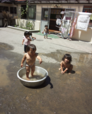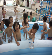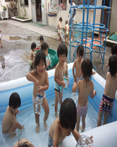 園庭に出るとさっそくかほちゃん、りほちゃんは水たまりに入り水しぶきを上げて楽しんでいます。またビニールプールにはかずまくん、こうたくん、みきちゃん、さなちゃん、かんなちゃんが入っていました。その横の小さなプールではまこちゃんが入り、はるとくん、ゆうきくんは水たまりで泥んこを楽しんでいました。かんなちゃんはプールの隅っこで皆の様子を見ています。