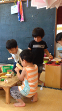 2歳児の子ども達は自分達の部屋で自分の椅子や、お台所セットを持って行き、よく遊んでいます。午後からプールを終えて、次々に部屋に入ってきた子ども達。「何してあそぶ?」と聞くとかずま君は、寺田さんに作ってもらった新しい木の包丁を見つけて、「おままごと!」と言いました。