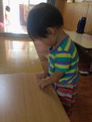 食事の後に椅子が乱れていたら、一つひとつ揃えて並べきれいにしたり、机に貼ってあったかほちゃんのマークが、床に落ちているとそれを拾ってテーブルに貼ったり。かほちゃんがどこに座っているのかまたかほちゃんはひまわりマークなんだと全てが一致したのか、もしくは誰かがはがしてしまった所を見ていたのか。しっかりかほちゃんのテーブルに貼ろうとしてくれます。