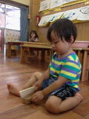 7月に途中入所したれお君は、最近とっても保育園に慣れてきてくれたように思います。たくさんのお友達はあまり受け付けず、体が拒否反応を起こしていたのですが、周りをよーく見ていたので最近は砂遊びや自分からお友達に関わるようになっていきました。少しずつ遊べるようになってからは今度は生活の色々な事もしてくれるようになりました。