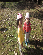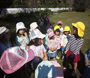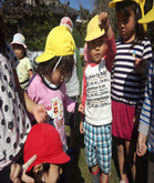 「2歳児さんもしよー!」の声かけにあみちゃん、かほちゃん、ゆうきくん、かんなちゃんも一緒に参加して逃げていましたよ。そうすけくんは広場の端っこに行き、落ちている毬栗を見つけ中の栗を取っていました。みきちゃん、まこちゃんは犬の近くに行き犬を見ていました。こうたくんは大きなクモを見つけ捕まえてみんなに見せていました。