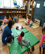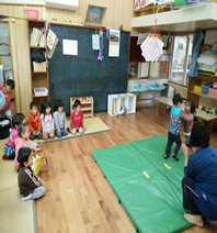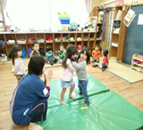 先日は久々の雨模様の天気となり散歩にいけなかったので部屋で相撲あそびをしました。部屋の真ん中にマットを敷いて順番に名前を呼んで相撲をとりました。久々の13名全員出席だったので、子どもたちが順番を待てるか少々不安でしたが、私の心配も何のそので、早くしたい!という思いが強くて、また自分の名前を早く呼んでほしいがためにしっかり座って待つことが出来ていた子どもたち。本当に成長を感じさせられた瞬間でした。