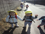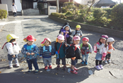 先月から1歳児と一緒にお散歩を楽しんでいる2歳児さん。先月後半は一緒に行く回数が少なかったので、今月はお弁当の日という事で一緒に行くことになりました。今回も小中、田代組と、前村、榎並組に分かれて出発しました。