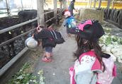 しかし2歳児はどんどん牛舎の奥に入って行きます。前回もでしたが、今回も牛舎の方の御好意でかずまくん、こうたくん、ゆうきくん達男の子はエサやりに挑戦!手つきも慣れたもので野菜やわらなどたくさんあげていました。いつもならかずまくんはずっとエサやりに夢中なのですが、この日ばかりはどうもお弁当が気になるようで「そろそろ帰ろう」「お腹すいた…」とアピールしているかずまくん。そろそろ帰ろうとしていた時に前村先生チームと合流。
