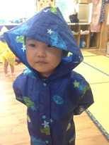 先週の土曜日は雨が降りました。2歳児さんはいつも元気いっぱいで、室内遊びだけでは燃焼しきれないほどのエネルギーがあるので、室内遊びだけではかわいそう…とカッパを着て散歩に行く事にしました。色とりどりのカッパを喜んで着る子ども達でしたが、外はだんだんと雨が強く降り始めました。