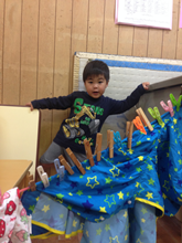始めは洗濯ばさみを挟む事に慣れず両手でしたり、逆さに持って挟もうとしてみたりと始めは一つ二つつけていた子ども達ですが、だんだんとおもしろくなると上手になってきていつの間にか、たくさんの洗濯ばさみをつけられるようになっていました。ゆうき君もいつの間にか脱いで洗濯もの干しを楽しんでいました。