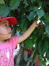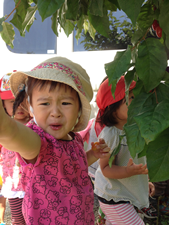 今年も緑がたくさん生い茂った木の間からたくさんのグミが赤く実っている事に気がつく子ども達。「これ何」「グミだよ」「グミ?」「赤いねえ」「いっぱい!」のやりとりを見ていたグミの木畑のおじさんがやってきて、「取っていいよ」と言ってくださいました。子ども達は「いいの?」と言って皆の様子をうかがったり、待ってました!とばかりにグミをちぎってぱくっと食べる子と様々でしたが、始めの一口の子ども達の表情はとても酸っぱそうで、しぶそうな顔を見せてくれました。