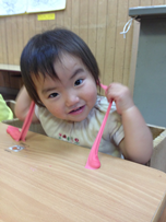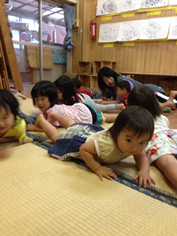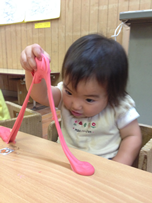 まこちゃんは机に置いたものを上に引っ張ると「トンネルだあ」と言って向こう側をのぞいていました。「くぐってみたら」と言うと上手に頭を入れてくぐる事が出来て楽しそうでした。2歳児の元気な子ども達が、気づけば30分も自分の席に座って遊んでいる事に小中先生と驚く事でした。