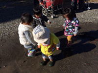 その日は支所方面に行きました。木の実などが大好きなしゅんたろうくん。途中オナモミを見つけては、「あった」「あった」といいながら自分の服につけたり、お友達につけたりとして遊んでいます。その姿を見て、ななみちゃん、りりちゃん、せいやくんも遊び始めます。オナモミを少し苦手としていたなつきくん。