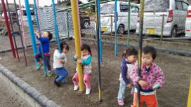 隠れること、見つからないことを楽しむ事がかくれんぼだと思っていた自分にとっては新しい発見でした。そんな中、羽虹衣ちゃんが転んでしまいました。すると自然と子どもたちが集まり「だいじょーぶ?」と起き上がらせ服についた砂をはらっていました。子どもたちの中ではしっかりと相手を思いやる気持ちが育ってきているなと思いました。こういった仲間の芽生えを確認し,嬉しく思うと同時にその繋がりがより深いものとなるように保育を狙っていきたいと思います。