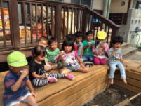 そして、残りはおやつの時にと箱に入れていると「せんせーごはんからたべよう」とななみさんが言うと私の「給食の先生に聞いてみよう」と言う言葉を最後まで聞かずに「聞いてみよう」とのあさんの言葉に「きいてみよう」(たいすけさん・せいやさん)と言いながら給食室に駆けだし「あるって」と帰ってきたななみさん・りゅうのすけさん。「外で食べよう」(しゅんたろうさん・こうがさん)「じゃあつくえもってこないと」(せいやさん・せいらさん)皆で話し合いこりす前の芝生の所にシートを敷き食べることになりました。