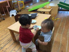 はるくくん(7ヶ月)は、みんながご飯へと行ってる間は、思う存分広い畳の空間で、おもちゃが使えるため、ゴロンゴロンと身体をいっぱい動かしながら声を出して遊んでいます!!給食がテーブルにくると、「マンマー」と“待ってました”というような動きで手を出して食べる子どもたちです。